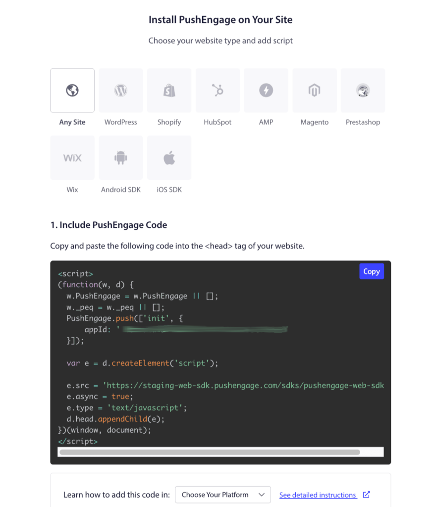 You only need to place the PushEngage Installation JavaScript code on your website, which would be the first step. You only have to complete the second step if you also intend to enable Web Push Notifications for your business.
