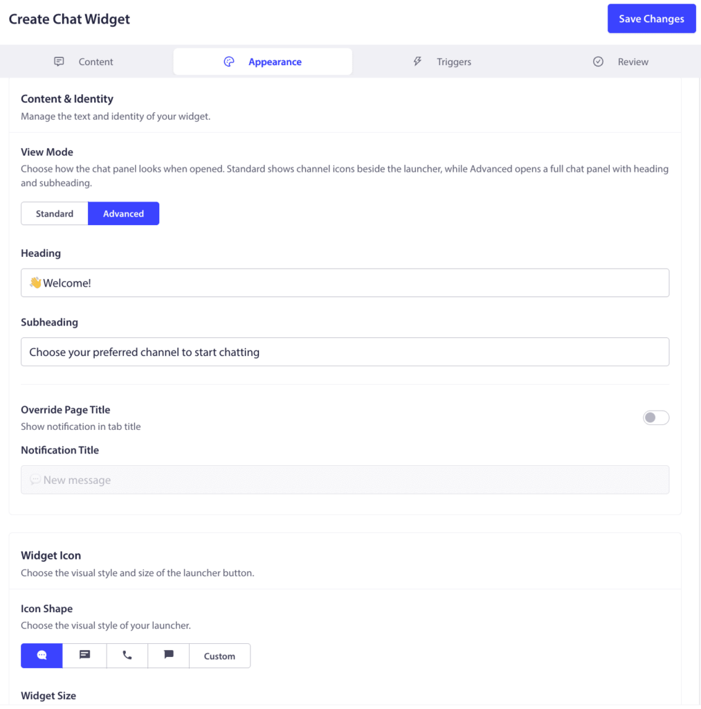 Navigate to the Appearance tab. Here, you can change the widget’s color to match your brand, adjust its on-screen position, size, font and even add the animations effect to suit your brand style.