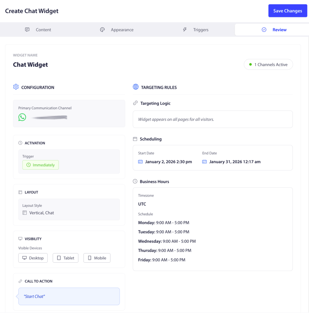 Go to the Triggers tab to control when and where the widget appears. You can have it show immediately on page load, after a few seconds, or even when a user is about to leave your site using the Exit-Intent trigger. You can also target specific URLs to show the widget only on relevant pages.