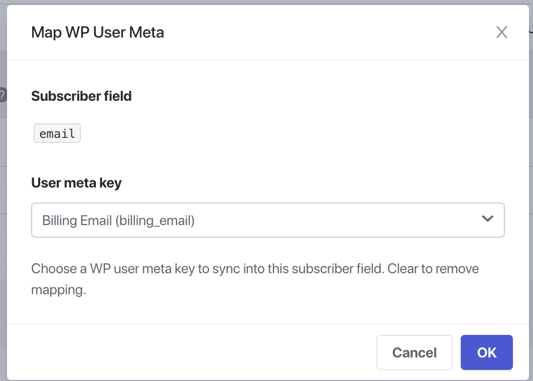 For example, in Subscribers’ Field you have pre-defined attribute as Email you can map it to WordPress Meta Tag Billing email.