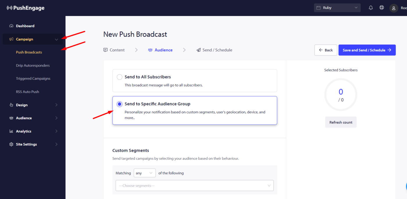 The Audience can be selected while sending out campaigns. You can click on Send to Specific Audience group.