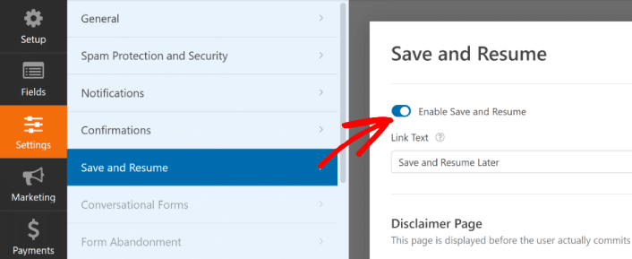 First, you’ll want to add the Save and Resume feature to your expense approval form. Go to Settings » Save and Resume from the form builder. To turn on save and resume functionality, toggle on the Enable Save and Resume option.